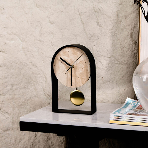 This elegant desktop clock is a fusion of function and style. Encased in beige marble with a sleek iron frame, it transforms any workspace into a gallery of design. Perfect for those who appreciate beauty in the details and precision in their day.